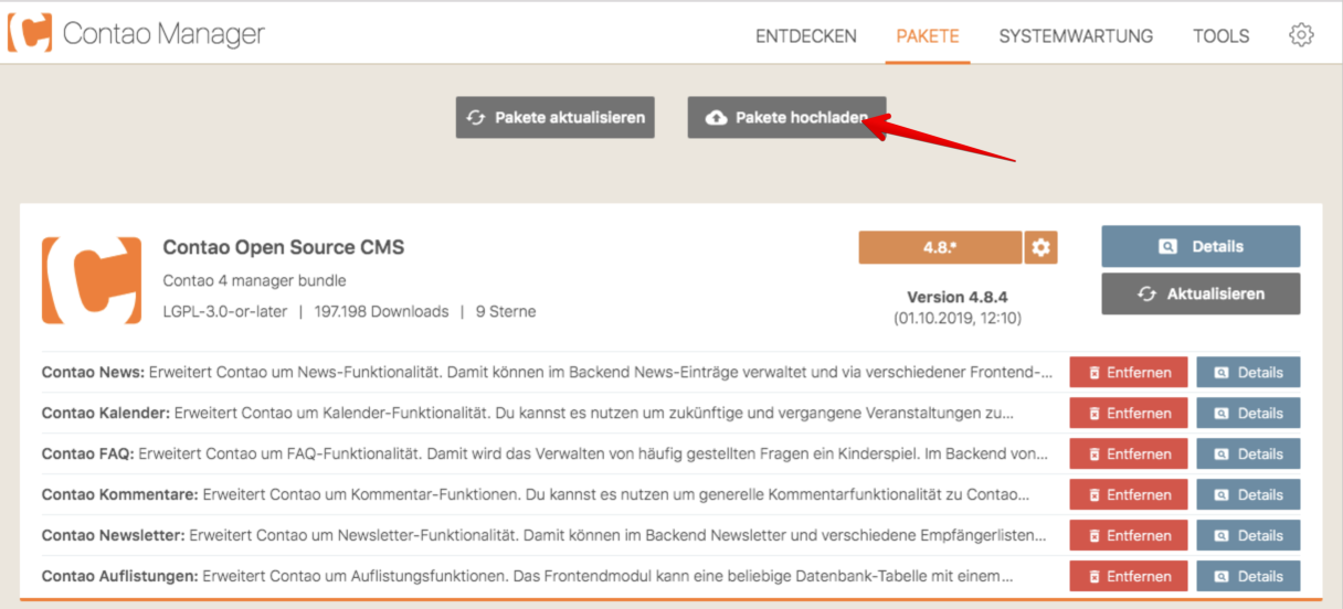Lade dann das Theme-Paket über den Contao Manager hoch, indem du das Zip-Archiv per Drag'n'Drop hochlädst oder den Button verwendest und das Zip-Archiv auswählst: