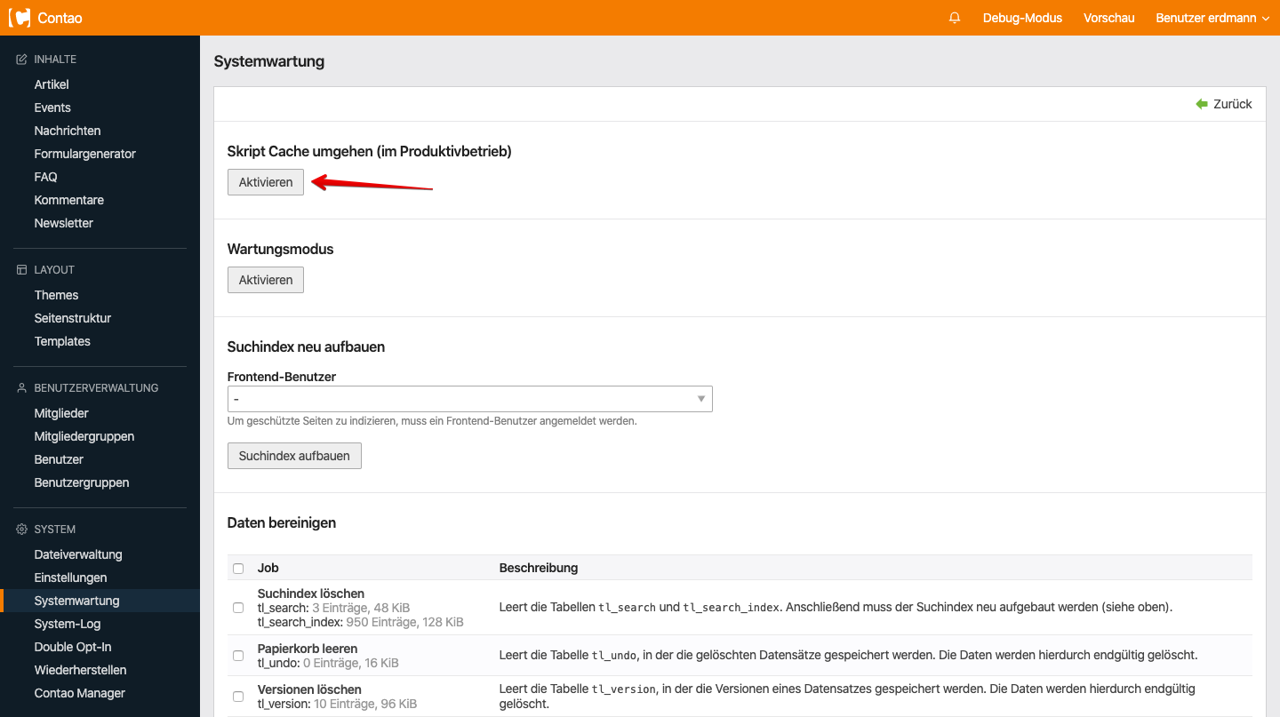 Gehe im Menü auf Systemwartung und aktiviere die Funktion „Skript Cache umgehen (im Produktivbetrieb)“. Dadurch werden SASS-Dateien nicht von Contao gecached und bei jedem Seitenaufruf neu geladen.