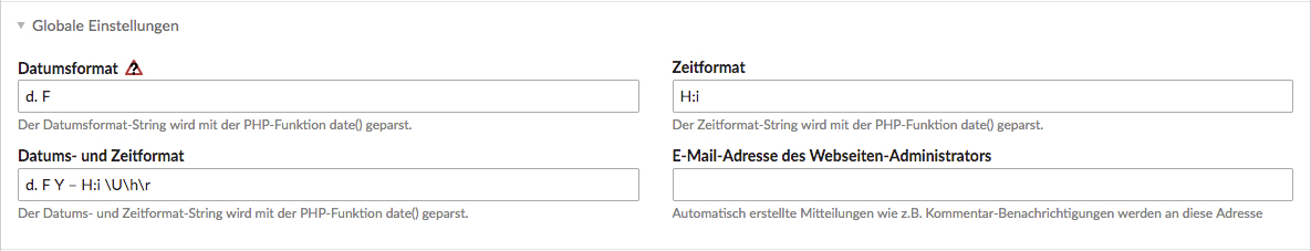 Im Seitenstartpunkt gibt es unter dem Punkt „Globale Einstellungen“ die Möglichkeit das Format für Datum und Uhrzeit anzugeben. Hier gibt es zum Beispiel die Möglichkeit den Aufbau und die Schreibweise über Verwendung bestimmter Buchstaben anzupassen (siehe auch PHP-Function date).